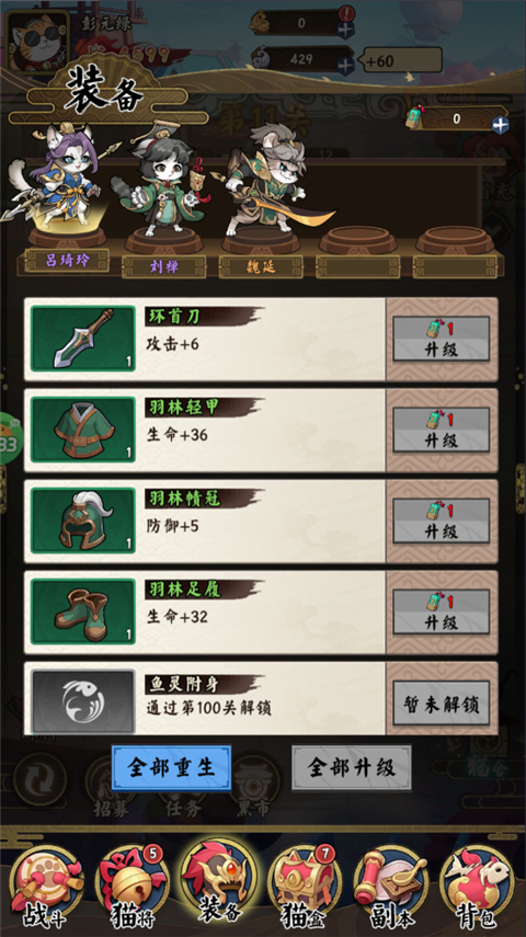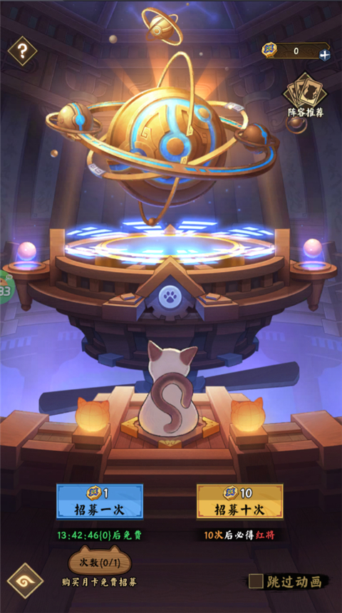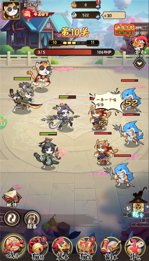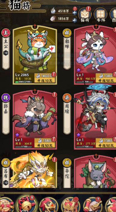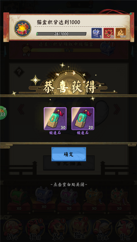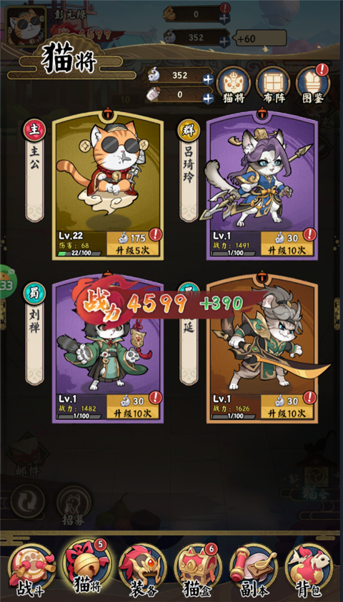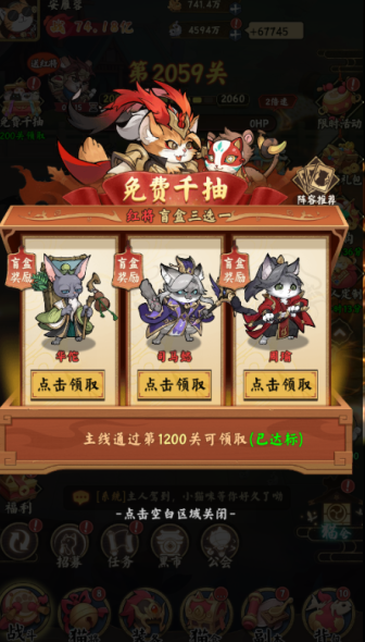 2、通过关卡会掉落各种猫盒宝箱,开启宝箱可以获取各种强力武将,武将也可以通过招募获取哦。