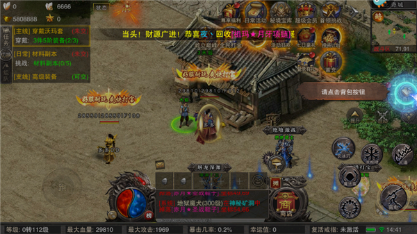 1、玩家在游戏中获得装备后,在游戏界面点击“背包”按钮。