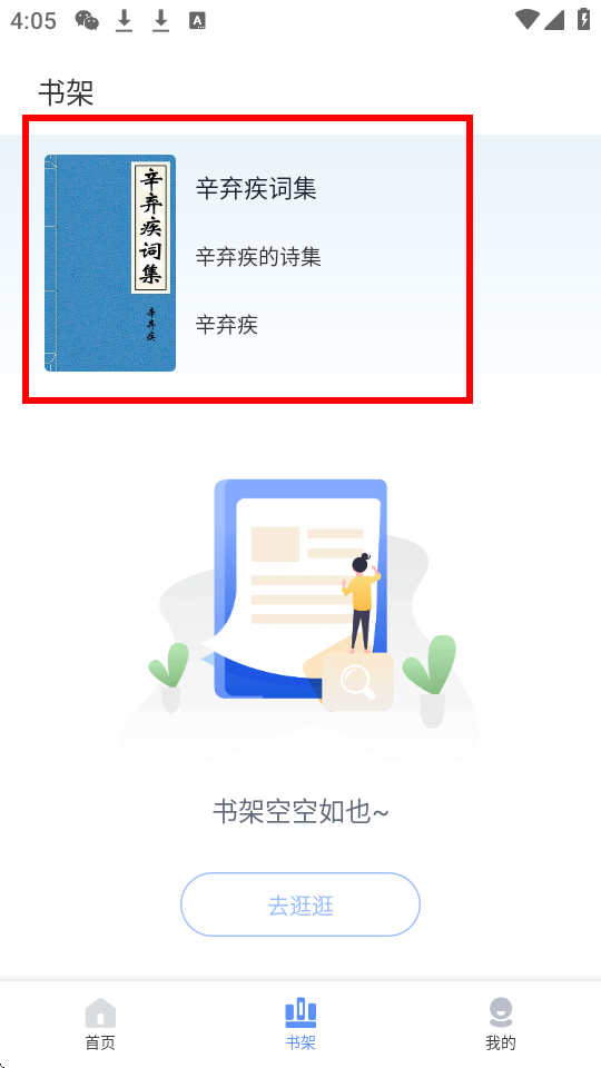 4、进入书架,可以查看最近正在阅读的小说,继续浏览和阅读。