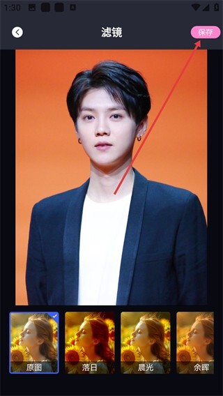 4、进入滤镜编辑页面后,可以选择“日落”、“晨光”等滤镜效果。调整完成后,点击右上角的“保存”按钮,即可完成图像滤镜的编辑和保存。