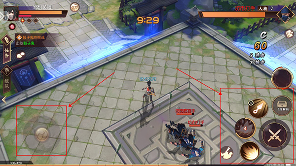 4、进入战斗场景后,玩家可以通过左侧轮盘控制角色移动,右侧按钮控制角色释放技能和攻击。