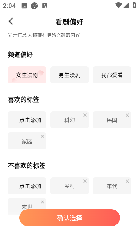 2、选择频道偏好和添加喜欢或不喜欢的标签,最后点击【确认选择】即可