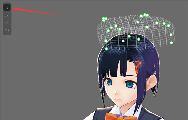 再往下,下面的每一栏都是一个曲面。随便点一个,你就能看到曲面网格,还能看到一些被黄色边框选中的头发,这些就是属于这个曲面的头发。拖动绿边白点,你就可以改变曲面的形状。这里同样可以使用右上角的按钮实现左右/前后对称操作。