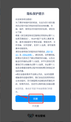 1、要打开考拉壁纸,请先单击隐私声明界面上的同意按钮,然后再继续使用。