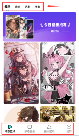 2、进入主界面后,您可以通过顶部导航或下面的菜单浏览和过滤您喜欢的壁纸。