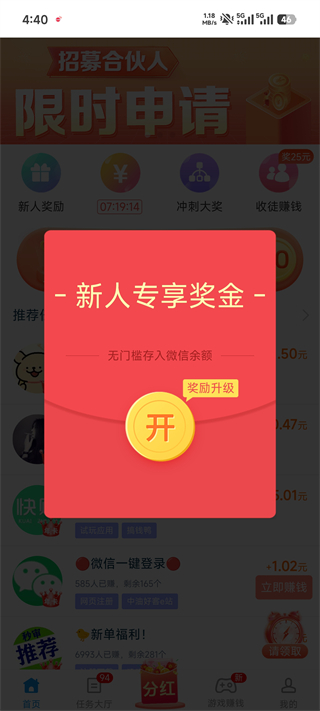 下载并打开趣闲赚 App,完成首次登录就能领取新人专属奖励,这笔钱无需任何门槛,可直接转入微信余额。