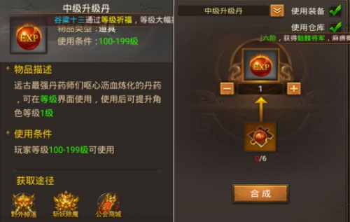 只能用于(100-199级升级使用)也可以升级丹碎片合成,需要6个碎片。