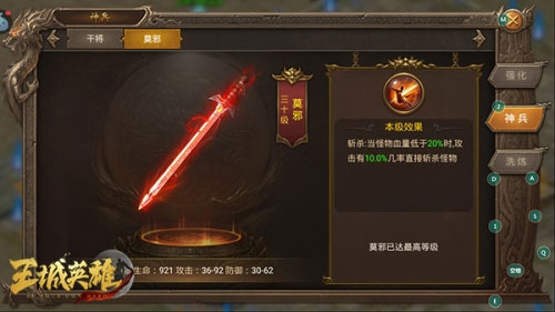 9、然后就是神兵系统(干将满级100级,莫邪满级30级)。前期有个神兵竞技,先搞干将的等级,提升需要的绑定元宝少一些,活动做完再搞莫邪,因为莫邪带的斩杀技能太强悍,而且vip boss也需要莫邪的斩杀属性,来快速通关领先其他人。