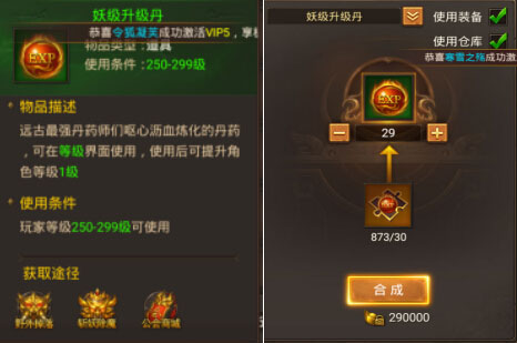 只能用于(250-299级升级使用)也可以升级丹碎片合成,需要30个碎片。