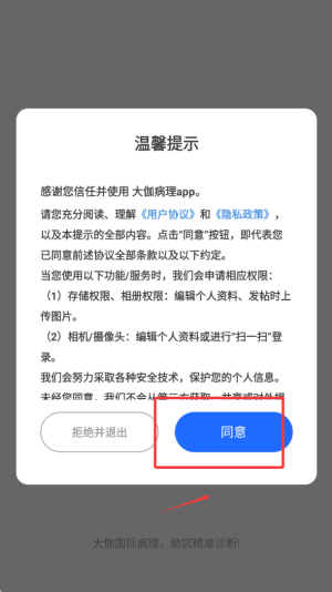 1、首次启动时,请仔细阅读并确认用户协议和隐私政策。点击同意按钮,进入医疗专业应用主界面。