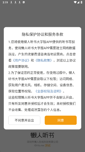 1、同意用户协议,进入懒人听书大字版app。