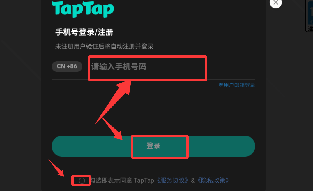 2、先在红色框框里打√然后输入电话号码获取验证码并登录。