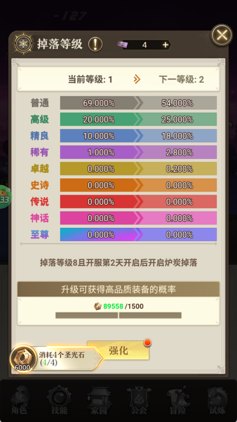 4、装备的掉落品质与玩家等级息息相关。你可以前往【掉落等级】提升登记等级,等级越高,击败怪物时获得的装备就越稀有。