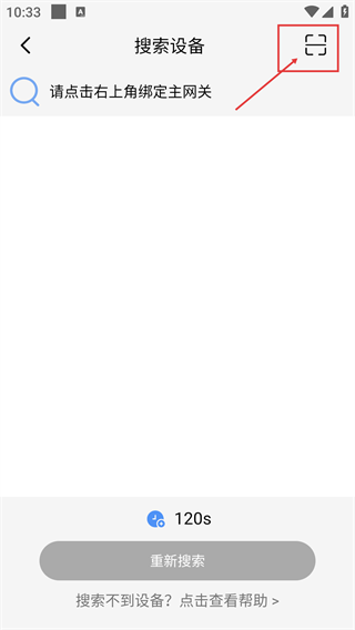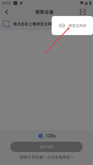 2、进入“搜索设备”页面后,点击右上角的相应图标,将弹出功能选项的弹出窗口,表示需要绑定主网关。