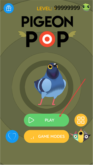 1、进入PigeonPop游戏界面后,点击下方绿色的PLAY按钮就能开始游戏,也可以通过GAMEMODES来选择游戏模式。