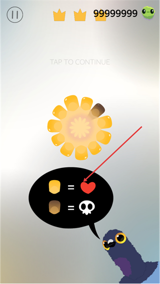 2、在这个界面里能看到提示,黄色玉米对应爱心,坏玉米吃了就会死亡,知晓这个规则后点击TAPTOCONTINUE就能继续推进游戏流程。