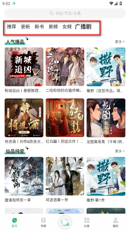 1、请在本站下载安装并打开小梨听书,可以看到首页上方有着推荐、最新、新书、男频、女频、广播剧等板块内容。