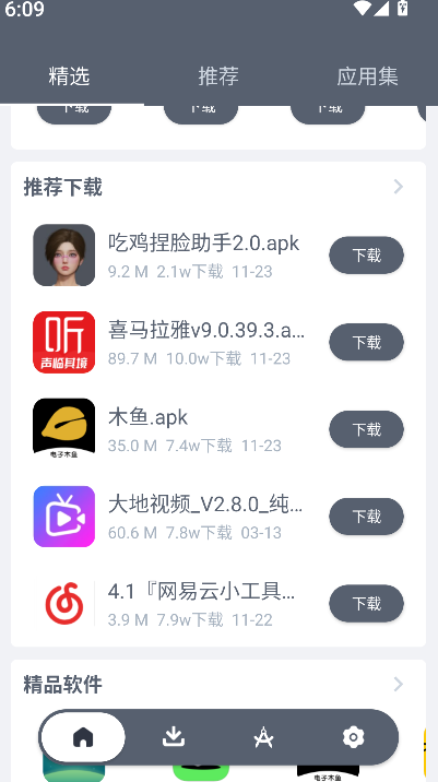 1、首页推荐的软件包括吃鸡捏脸助手、喜马拉雅、木鱼等,覆盖娱乐和工具类别,便于用户快速找到并获取常用应用。