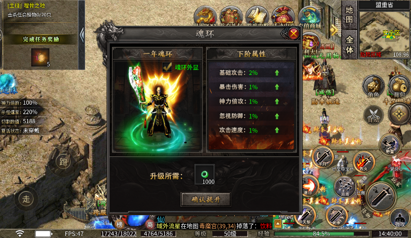 4、在下三大陆之前,将能提升属性的功能提升下,可在线路外层打点装备,玛法旧世可打到《沉默·黄金屠龙》及《逆鳞臂章》这个可以一直用到四大陆。