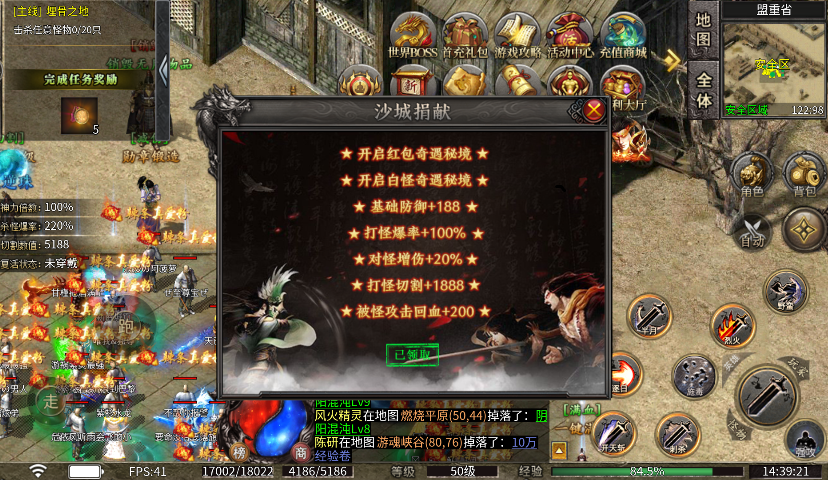 1、玩家必定领取的“沙城捐献”,在主城的上方即可领取,可以极大增强角色的能力。