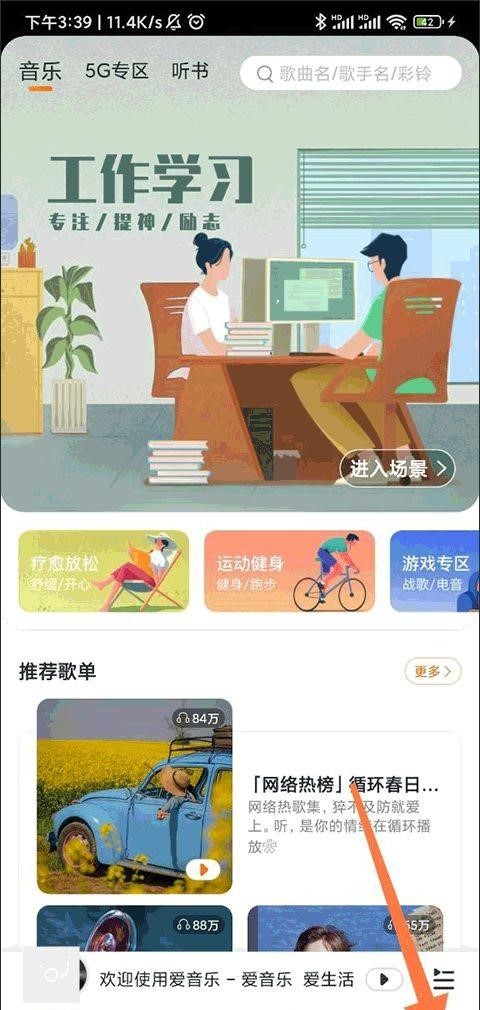 1、首先,打开爱音乐应用程序的官方版本,在主页上,一些播放列表将根据您的收听偏好智能推送给您。