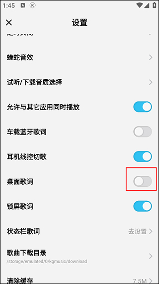 3、进入到设置页面,向下滑动屏幕找到“桌面歌词”选项,点击右侧的开关按钮。