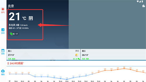 1、24小时预报:提供未来24小时的详细天气预报,包括温度、湿度、风速和其他信息。