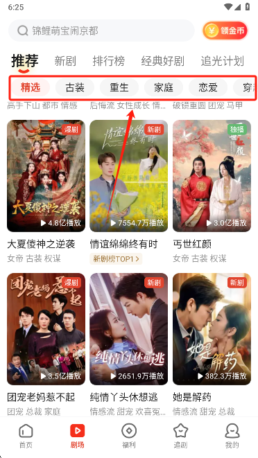 2、点击顶部的栏目可以切换短剧类型。