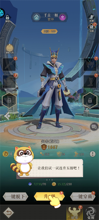 前期优先升级主力英雄,一键穿戴/脱下装备快速配装,完成新手任务可解锁满星花木兰,培养零压力。
