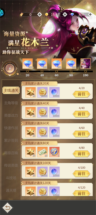 完成主线累计通关任务,领取钻石、星币、英雄核心等奖励,100关解锁满星花木兰核心。