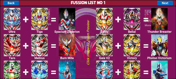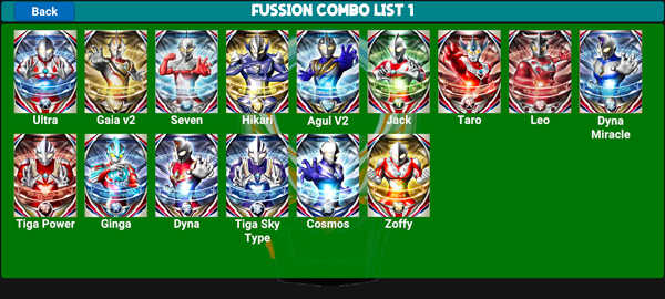3、点击右上角fussion list可以查看欧布奥特曼不同形态的合成方式。