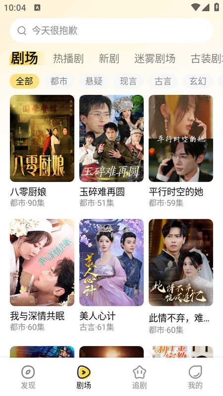 1、下载、安装并打开本网站上的软件。进入软件主页查看推荐的短剧,或点击“剧院”按城市、悬疑、时事、古剧等类别搜索短剧。