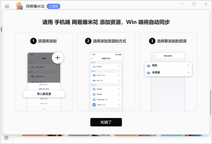 2、登录后在手机端网易爆米花添加资源,Win 端将自动同步。