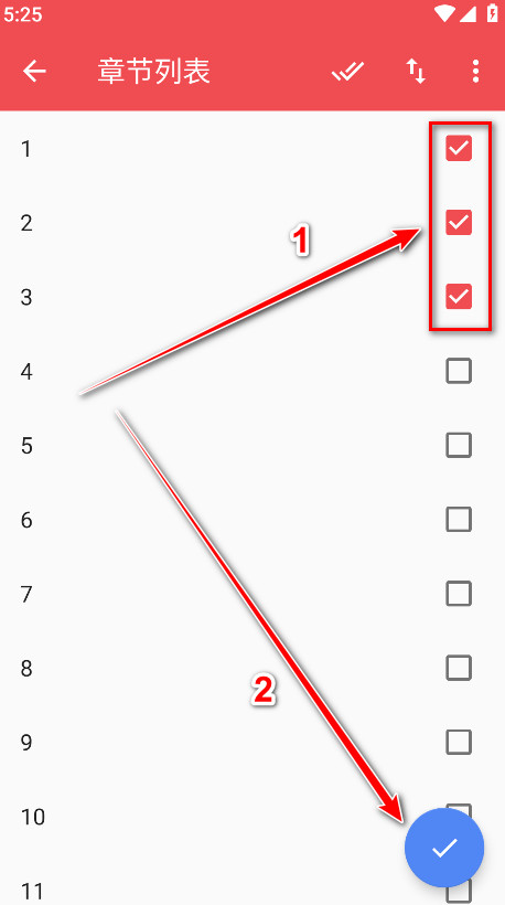 4、检查需要下载的章节(点击右上角的两个√图标选择所有章节),然后点击右下角的√按钮继续。