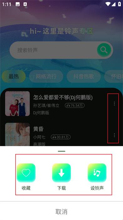 4、最后,点击音乐后的三个点,将弹出下载和保存按钮,如下图所示。铃声设置完成。