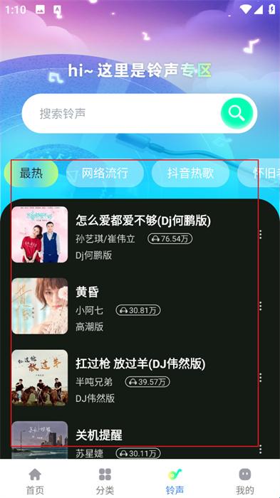 3、随后,切换到“铃声”页面,您可以在其中看到最近流行的一些铃声,所有铃声都可以选择。