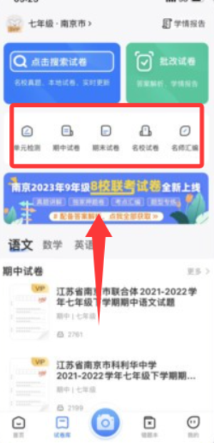 1、搜索并下载试卷,在主页上输入科目和年级关键字,过滤当地知名学校的试卷,点击下载,它们将自动保存在我的考试文件夹中。