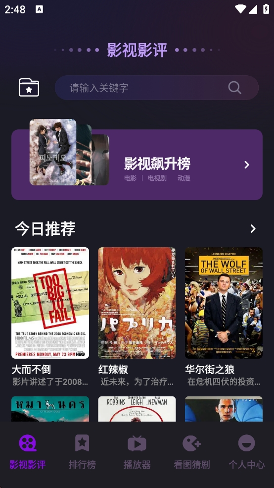 1、主页为每个人推荐热门电影评论,并提供飙升的电影和电视排行榜。