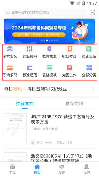 1、打开道客阅读应用程序,在主页上,您可以看到各种文档供您阅读。