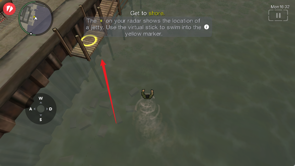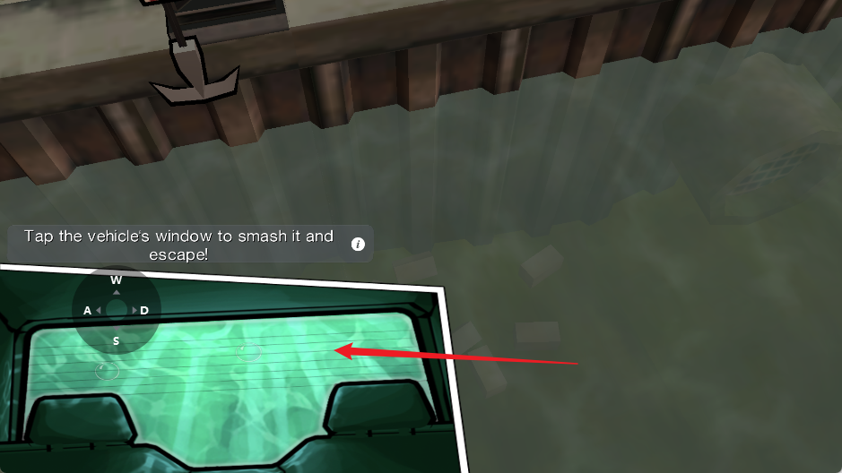 2、连续点击车的前窗,破窗后根据雷达提示来到岸边的提示点处。