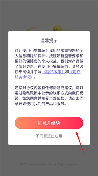 1、在本站上下载小猫快玩后,登录软件,首次使用,我们需要阅读温馨提示。