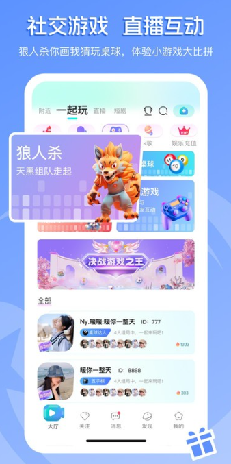 1、直播:用户可以实时观看主播的直播内容,包括游戏、唱歌、跳舞等。