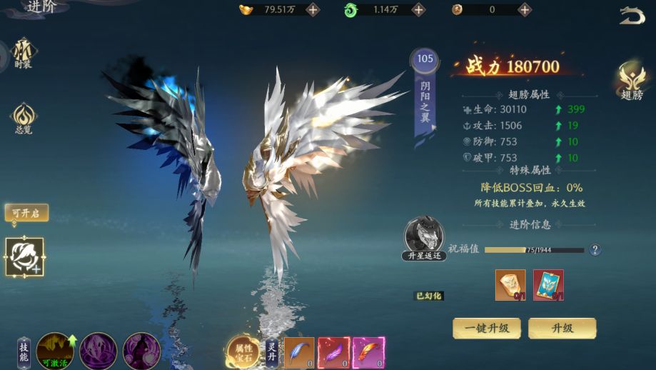 翅膀可升级和幻化,消耗灵翼进阶丹和灵翼祝福卡等,还能激活技能,从而提升战力。
