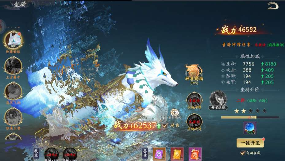 已经激活的坐骑可以进行升星,升星后属性加成和阶数都能提高,还能提升兽魂,让你的坐骑更强。