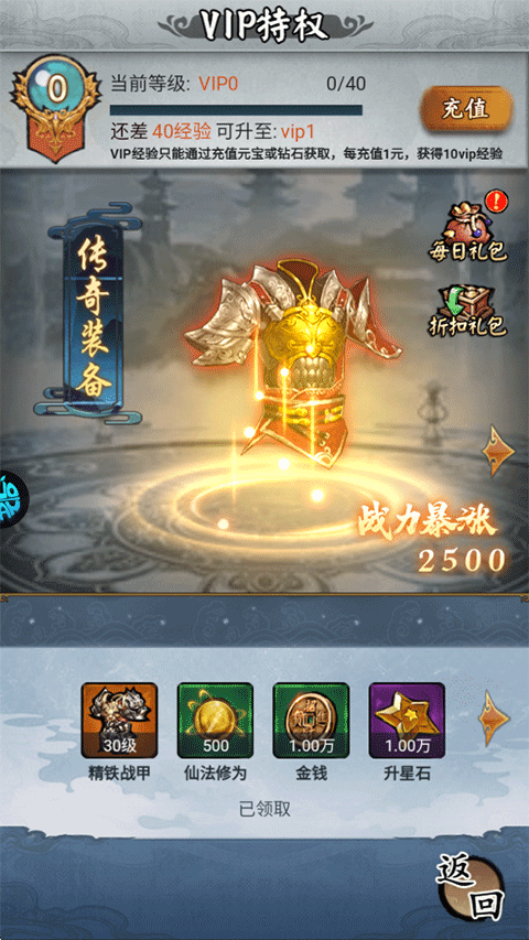 1、VIP0:精铁战甲*30级、仙法修为*500、金钱*1w、升星石*1w。