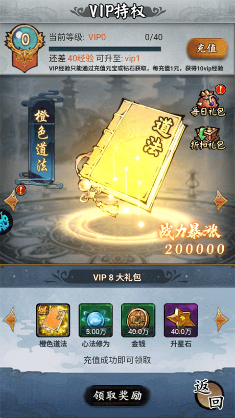 9、VIP8:橙色道法、心法修为*5w、金钱*40w、升星石*40w。