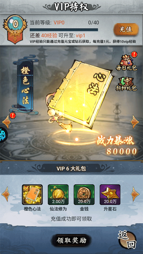 7、VIP6:橙色心法、仙法修为*2w、金钱*20w、升星石*20w。
