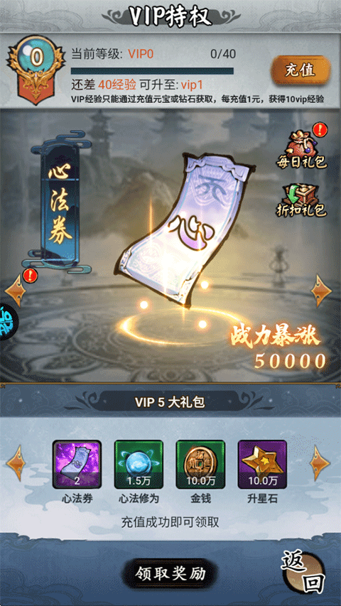 6、VIP5:心法券*2、心法修为*1.5w、金钱*10w、升星石*10w。