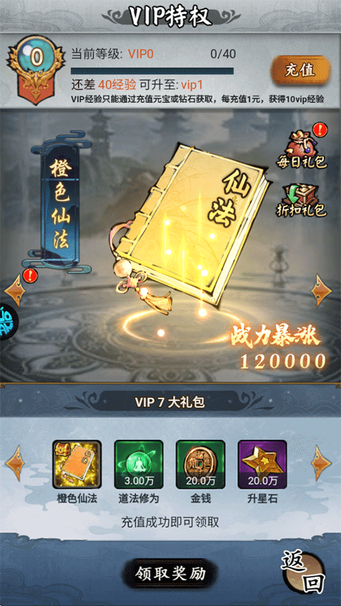 8、VIP7:橙色仙法、道法修为*3w、金钱*20w、升星石*20w。