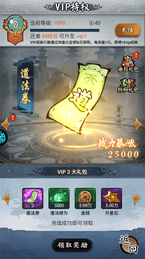 2、VIP1:吐纳静心诀、道法修为*2000、金钱*2w、升星石*2w。